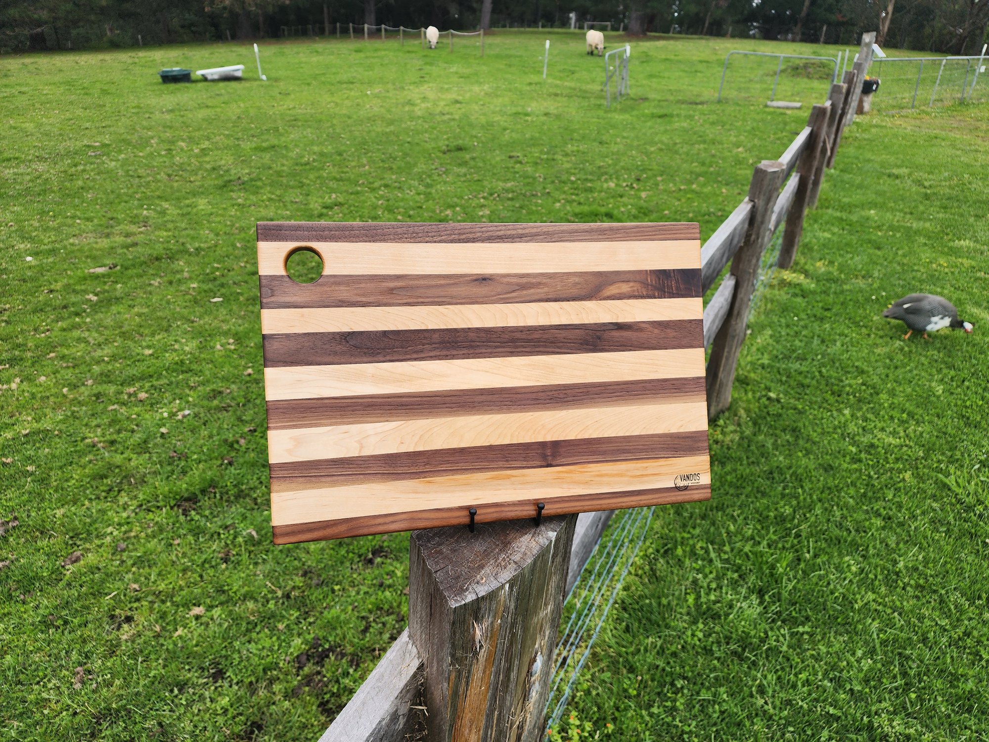 Crafted from American Walnut with elegant Rock Maple accent stripes, these cutting boards celebrate the natural beauty of premium timber. Every board highlights its own character—warm grain, rich colour, and unique tonal shifts. Sealed with a nourishing beeswax oil for a silky, durable finish.