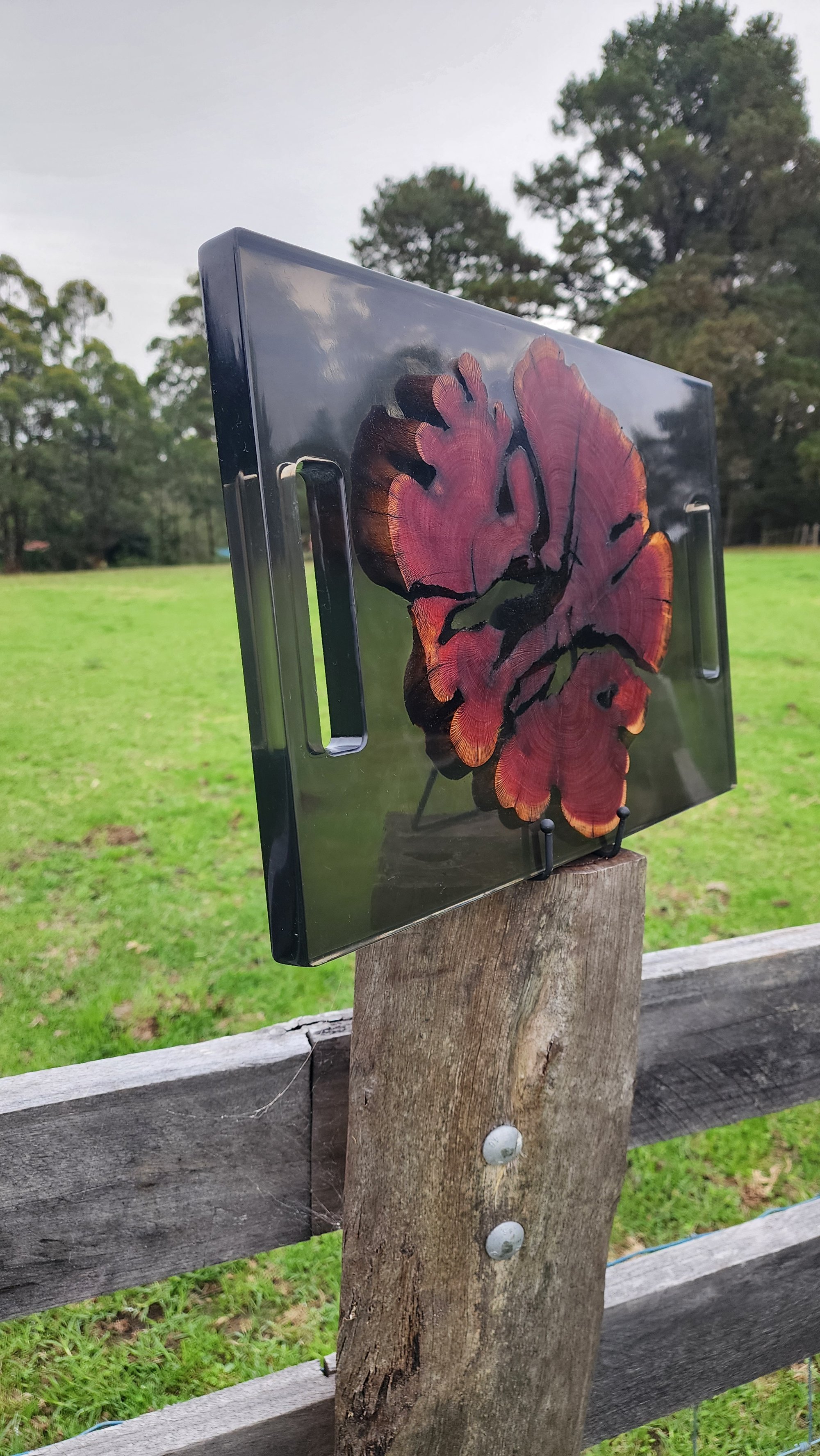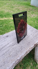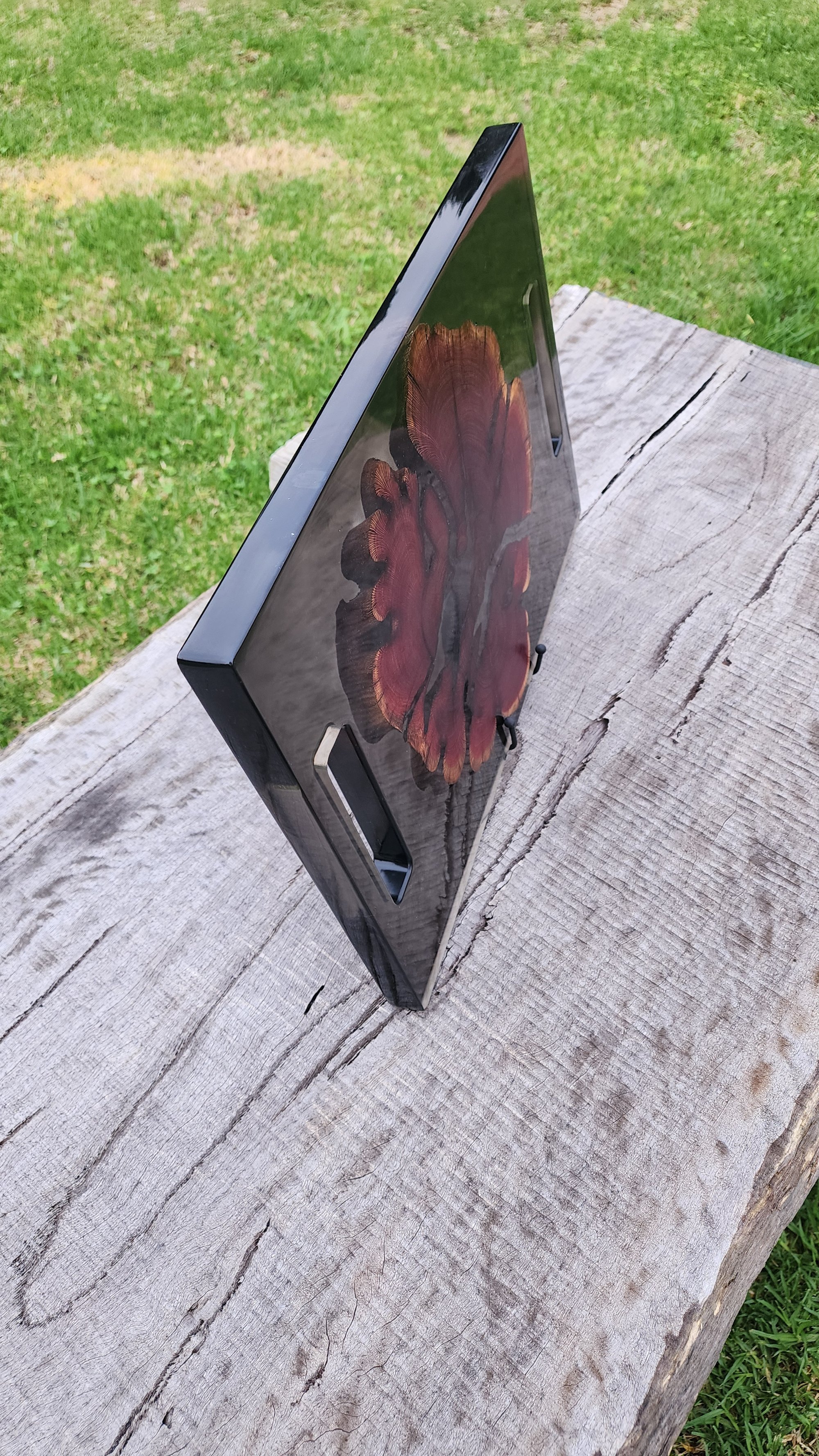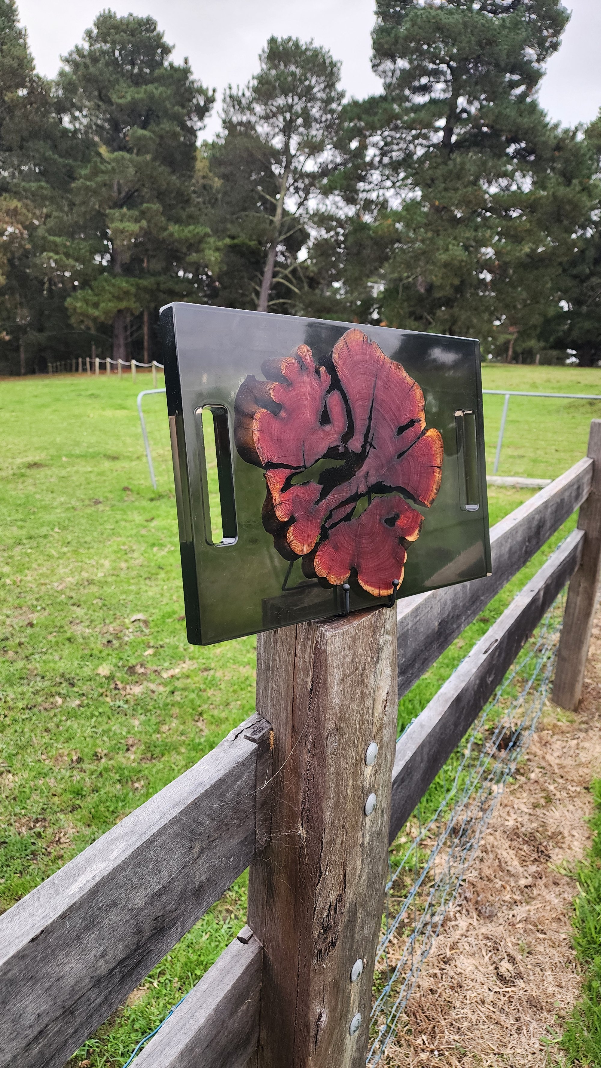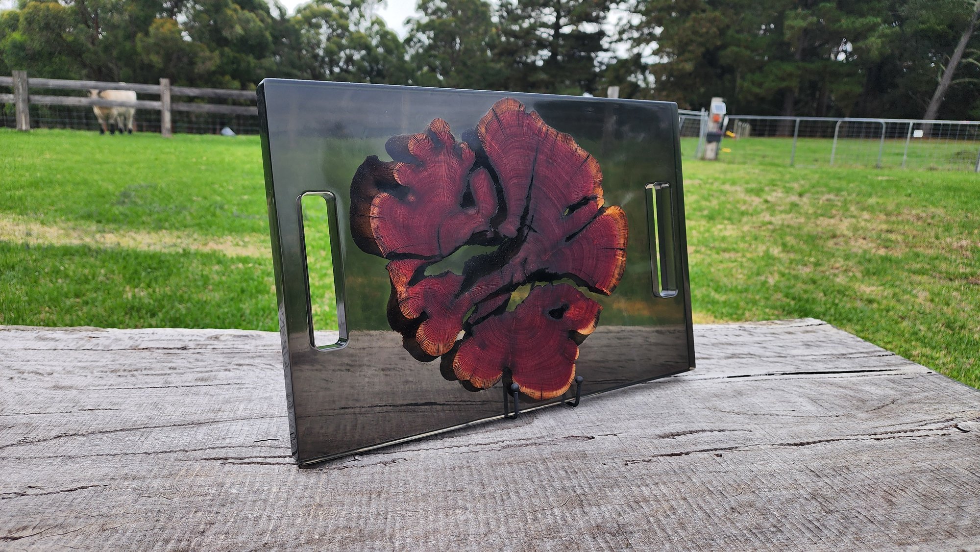This striking piece features a Californian Red Cedar cookie preserved within a deep black tinted resin surround, highlighting the natural beauty of the timber. The vivid red and burnt amber tones of the cedar create a dramatic contrast against the dark resin, while the intricate growth rings and natural cracking patterns form a captivating organic design.