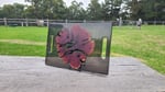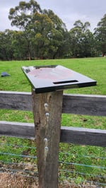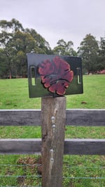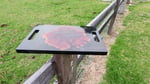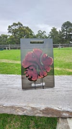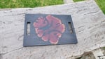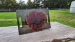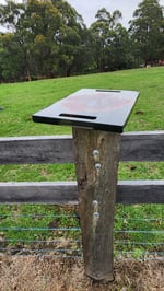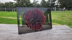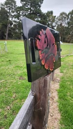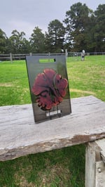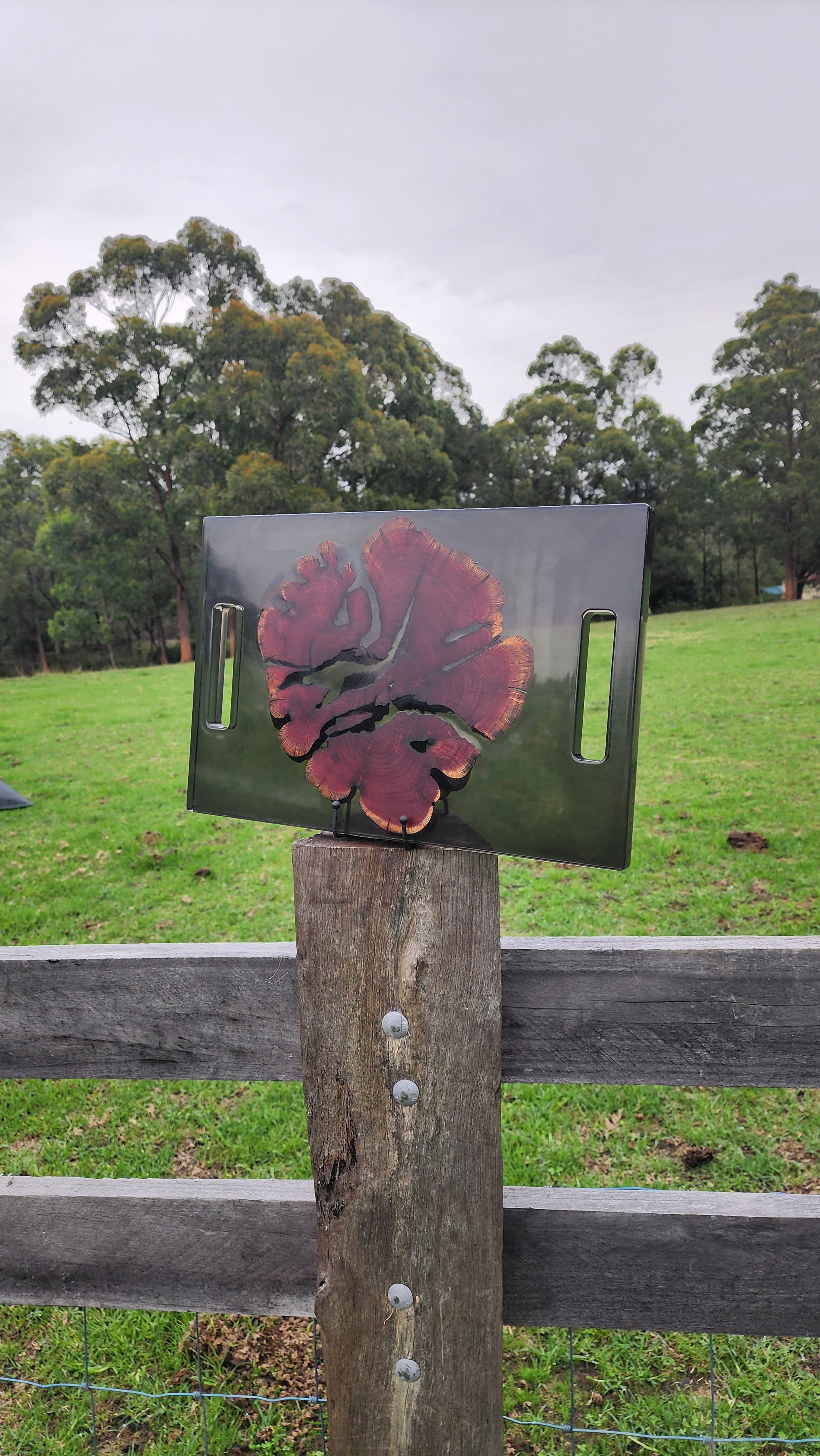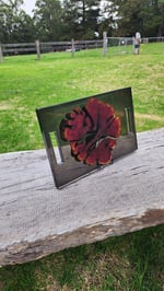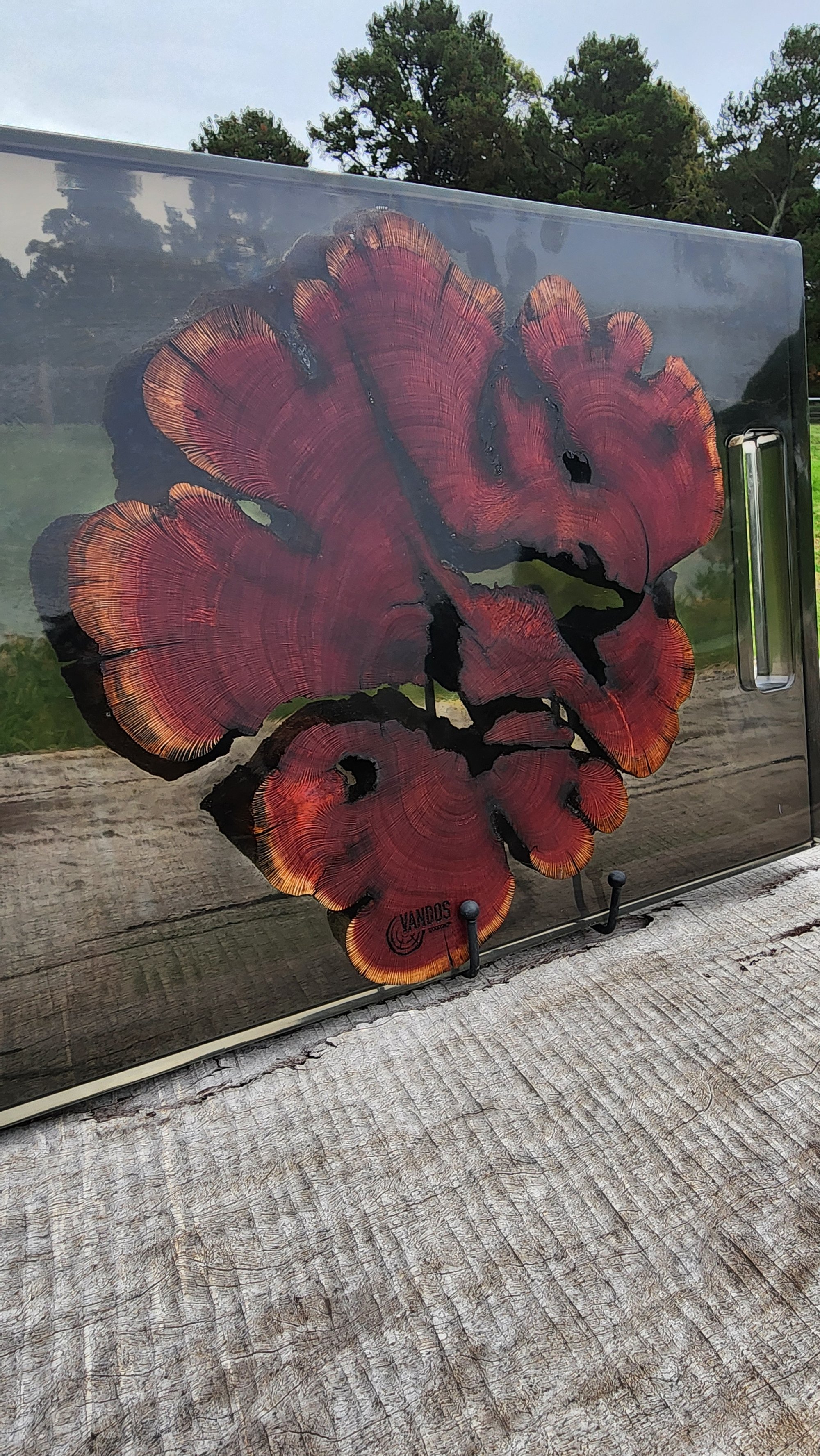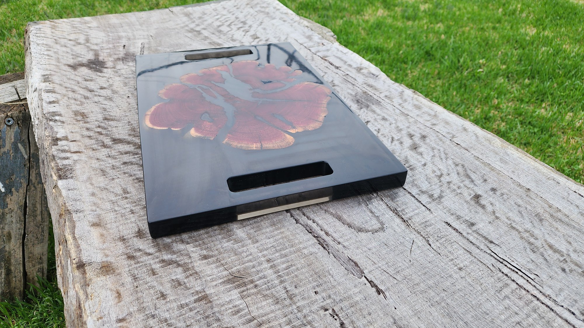 This striking piece features a Californian Red Cedar cookie preserved within a deep black tinted resin surround, highlighting the natural beauty of the timber. The vivid red and burnt amber tones of the cedar create a dramatic contrast against the dark resin, while the intricate growth rings and natural cracking patterns form a captivating organic design.
