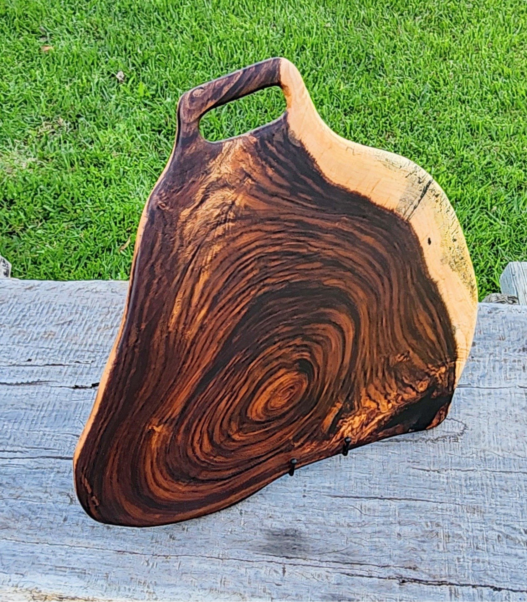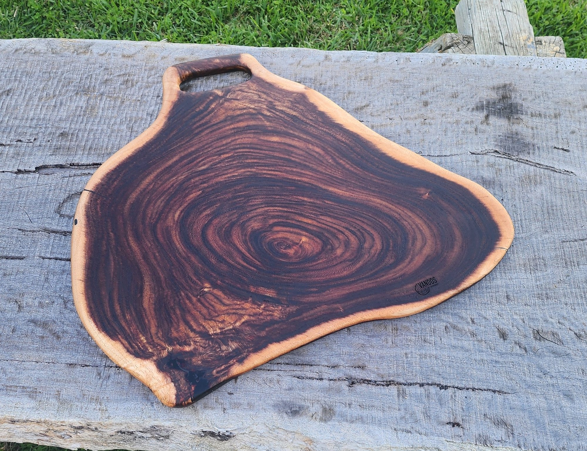 Crafted from richly toned rainforest hardwood, this board embraces a more organic, free-form shape that highlights the natural flow of the timber. Deep chocolate hues dominate the heartwood, framed by a lighter outer edge that enhances the contrast and visual depth.