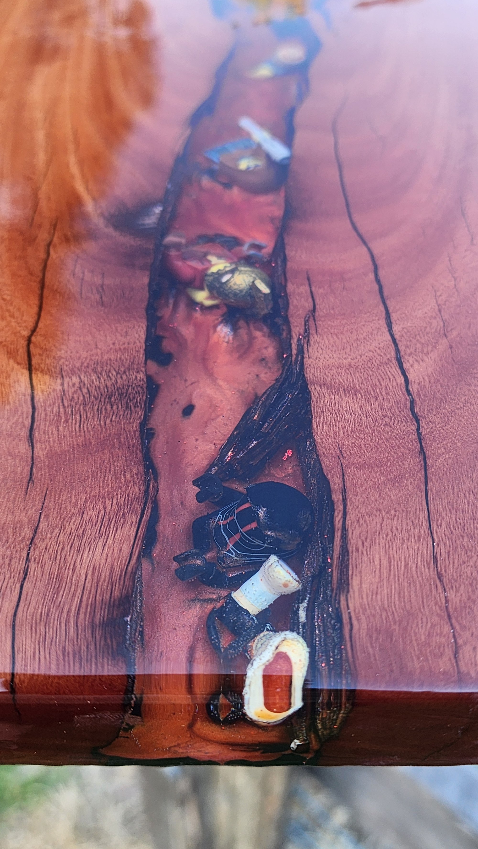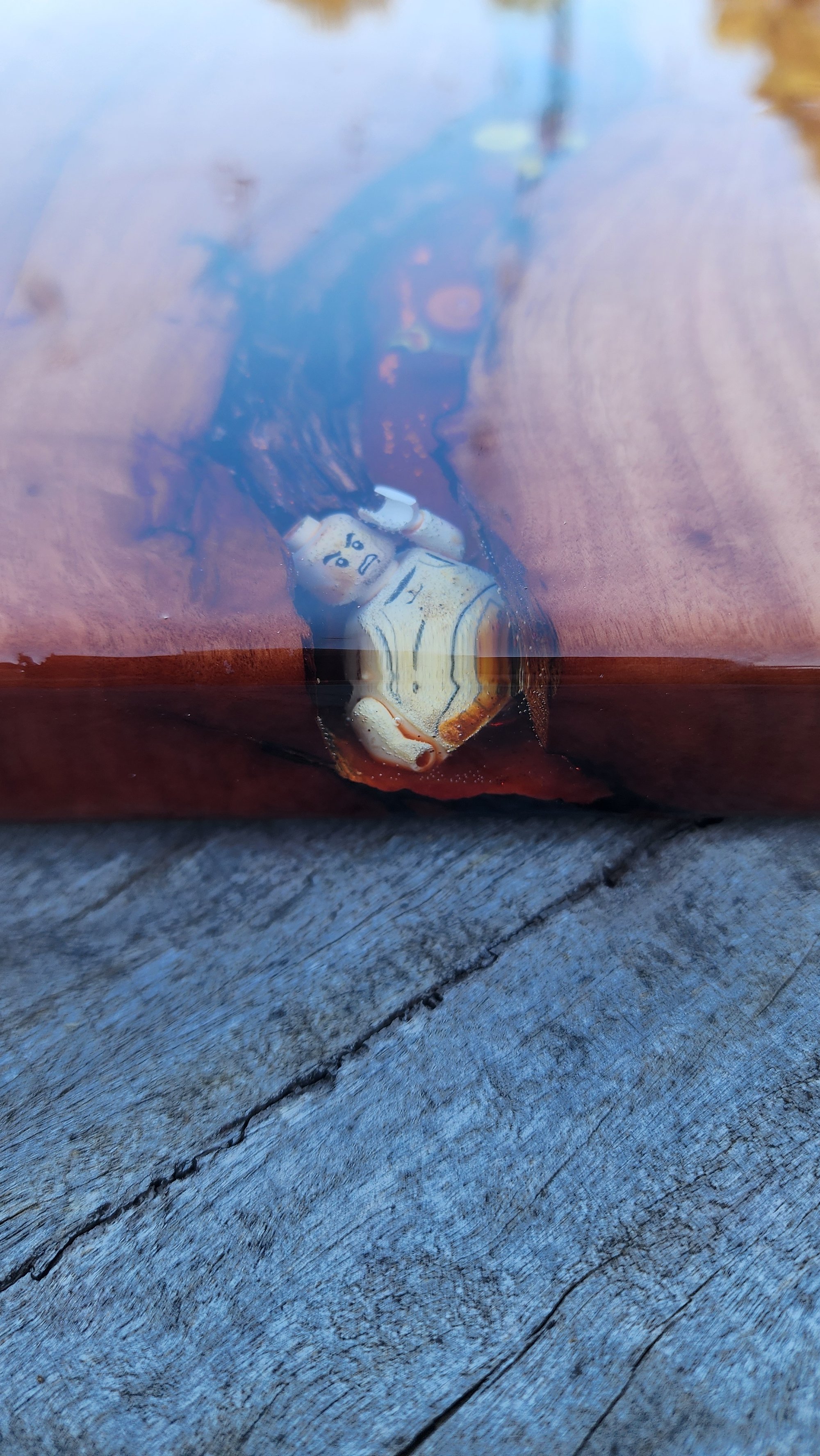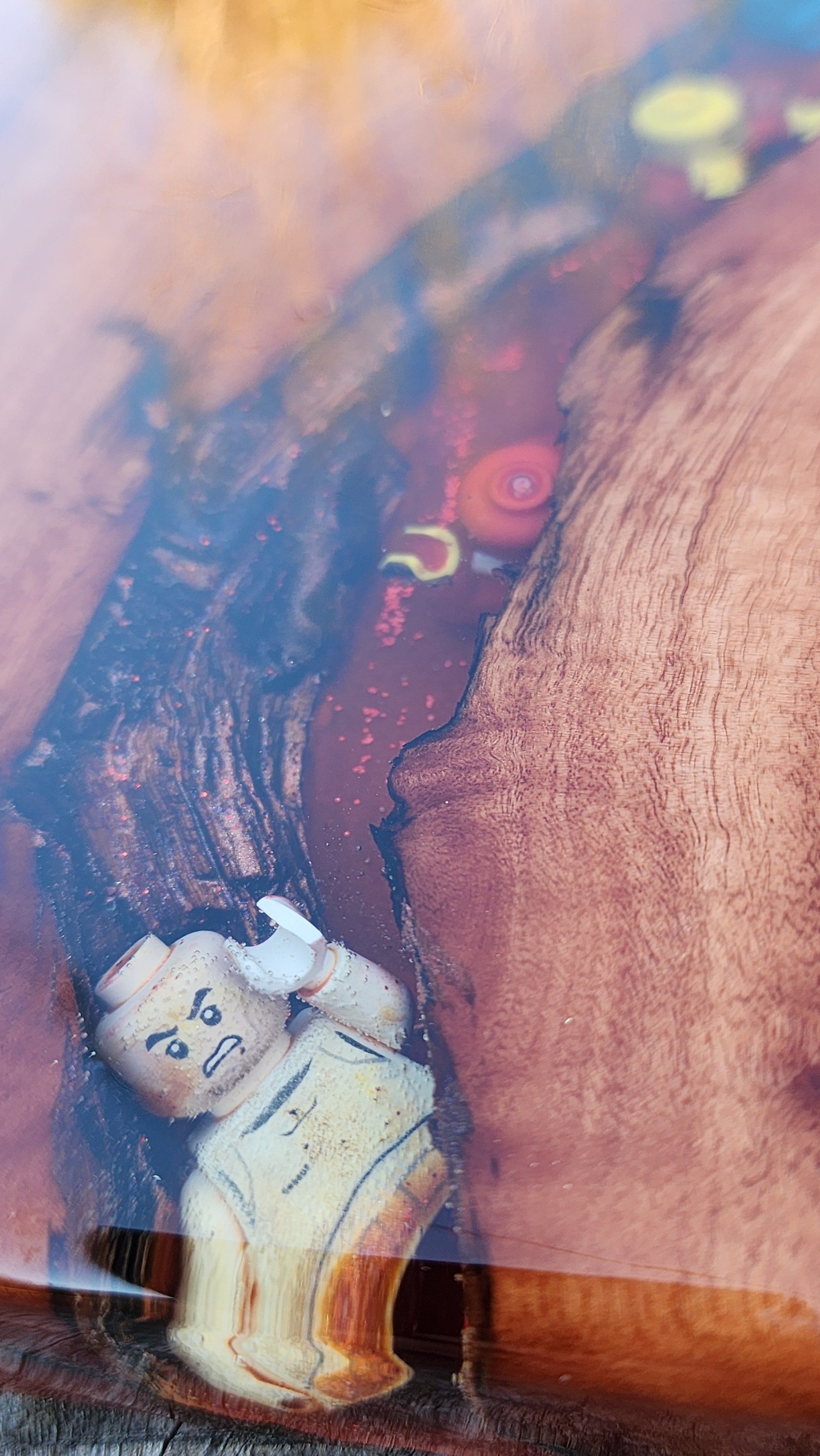 Featuring a striking molten lava resin inlay flowing through the natural split in the timber, this board captures the moment a fiery eruption rises from beneath the surface… unfortunately trapping a few unlucky Lego men in its path as they melt and are slowly swallowed by the flow.